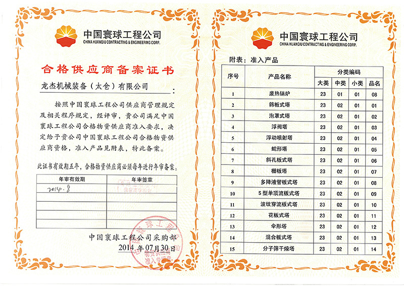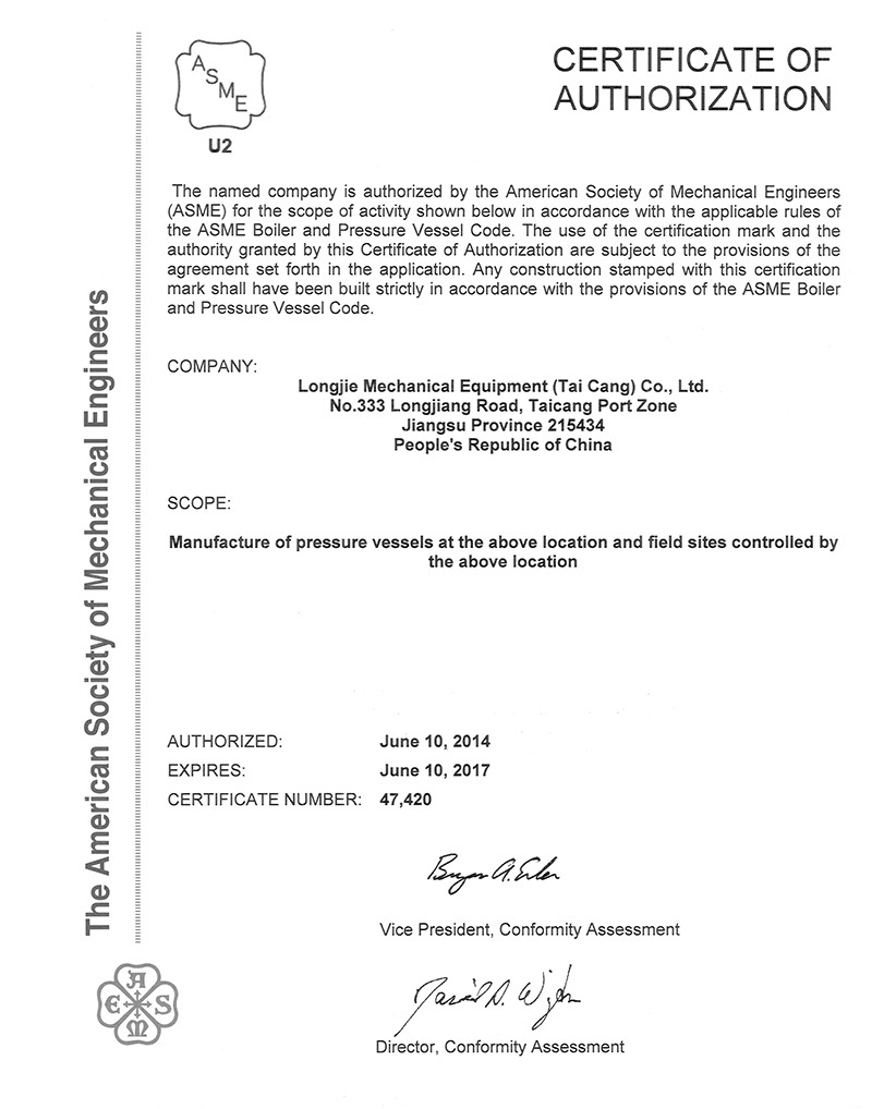 公司具有中國高、中低壓壓力容器生產(chǎn)許可證(A1級, 包含設(shè)計、制造),ASME U、U2鋼印證書,PED G模式生產(chǎn)資格,是中石化、中石油、中海油、中化集團、國家能源集團等大型知名企業(yè)的合格供應(yīng)商。